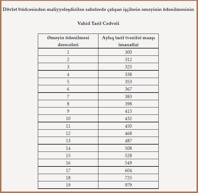Cədvəldən göründüyü kimi, dövlət büdcəsindən maliyyələşdirilən sahələrdə çalışan işçilərin əməyinin ödənilməsinin Vahid Tarif Cədvəlinə əsasən elmi tədqiqat institutlarının direktorları, əsasən 19-cu dərəcəyə uyğun maaş alır. Həmin dərəcə ən yüksəkdir və vəzifə maaşı 979 manatdır.