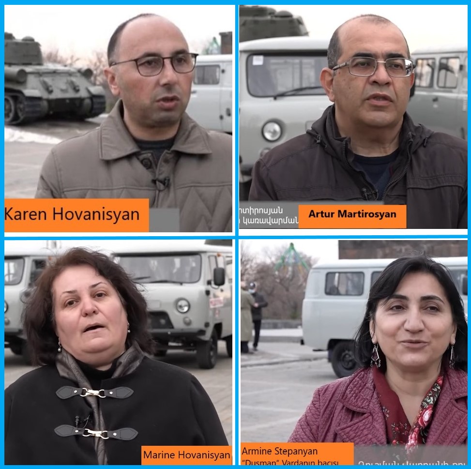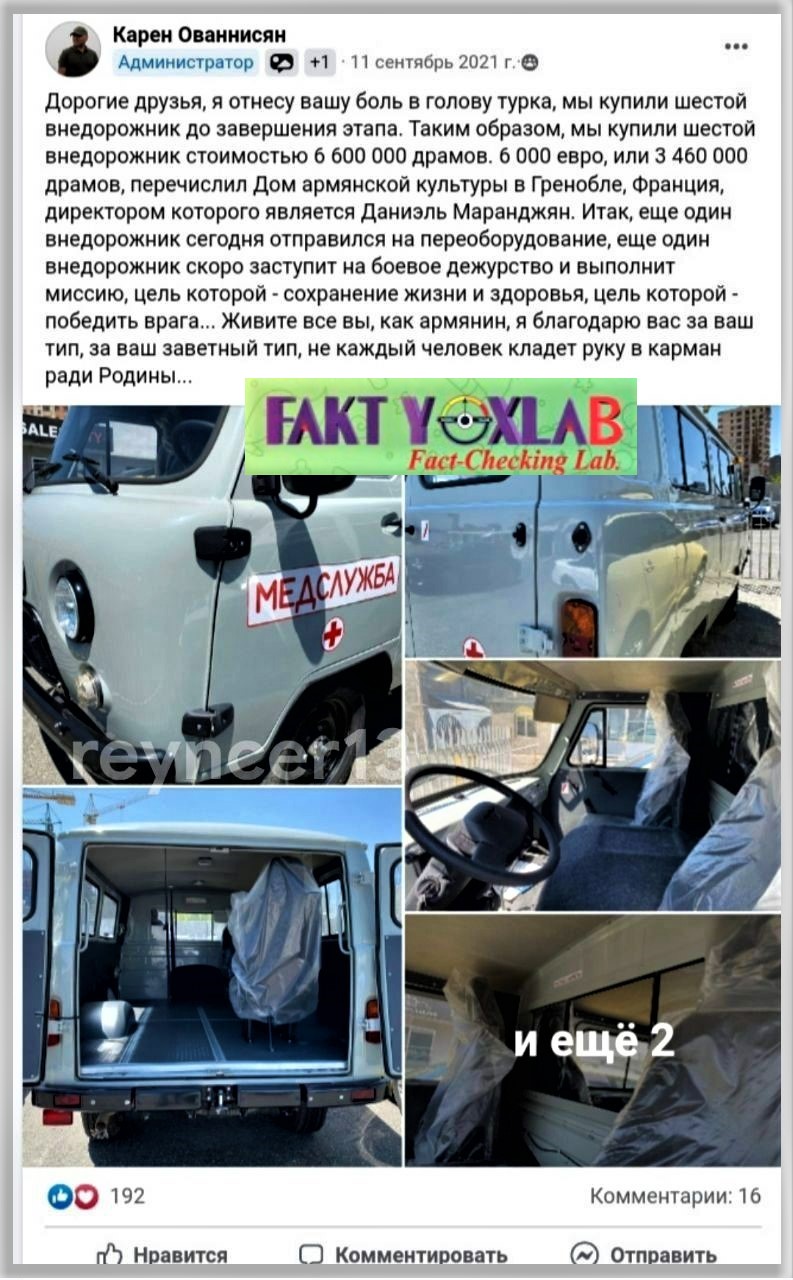 Karen Ovanisyan yazır: Əziz dostlar, mən sizin ağrınızı türkün başına tökülsün. Biz, mərhələni tamamlamaq üçün 6-cı yolsuzluq maşını almışıq. Beləliklə, biz 6 000 000 dram dəyərində 6-cı yolsuzluq maşını aldıq. 6000 avro və ya 3 460 000 dramı direktoru Daniel Marancanyan olan Grenobldakı (Fransa) Erməni Mədəniyyət Evi köçürüb. Beləliklə, daha bir yolsuzluq maşını bu gün yenilənməyə (çevrilməyə-) göndərildi. Daha bir yolsuzluq maşını tezliklə döyüş növbətçiliyinə gedəcək və üzərinə düşən missiyanı- insan həyatını və sağlamlığını qorumaq və düşmənə qalib gəlmək missiyasını yerinə yetirəcək. Erməni kimi yaşayın. Mən sizə tipinizə, əzilməmiş (sınmamış) tipinizə görə təşəkkür edirəm. Hər adam vətəni üçün əlini cibinə salmır.