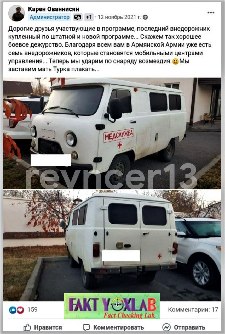 Karen Hovannisyan yazır: Bu paylaşım yalnız qapalı qrup üçündür və burada olan fotoları dərc etmək qadağandır. Bu bizim aldığımız sonuncu maşındır. Mebelləşdirmə amerikalı dostumuzun hesabına aparılır. Qiyməti 2 500 000 dramdır. Texniki dəstəklə bağlı bəzi işlər bitəndən sonra bu maşın rayonu tərk edəcək və döyüş növbətçiliyinə başlayacaq. İcazənizlə sizə digər şad xəbəri çatdırım. Hökumət bu texnikaların yeniləyən (çevirən) təşkilata 10 avtomobil ayırıb. Başqa sözlə, hökumət 10 maşının “çevrilməsi” üçün pul ayırıb. Nəhayət, biz bu “mobil idarəetmə mərkəzləri”nin əhəmiyyətini sübut edə bildik. Bu bizim proqramın qələbəsidir.