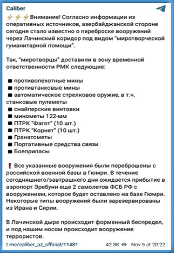 Öncə qeyd edək ki, təkcə ötən 2 ay ərzində Ermənistandan Xankəndiyə silah və terrorçu daşınması haqda Azərbaycan mediası səhih məlumatlar yaymışdı. Məlumatlardan birini caliber.az saytı yaymışdı. Məlumatda “sülhməramlıların müvəqqəti məsuliyyət zonasından külli miqdarda silah-sursat, portativ rabitə və digər texnikaların Xankəndiyə ötürülməsi qeyd olunurdu.