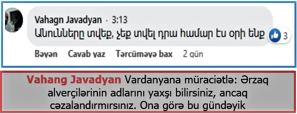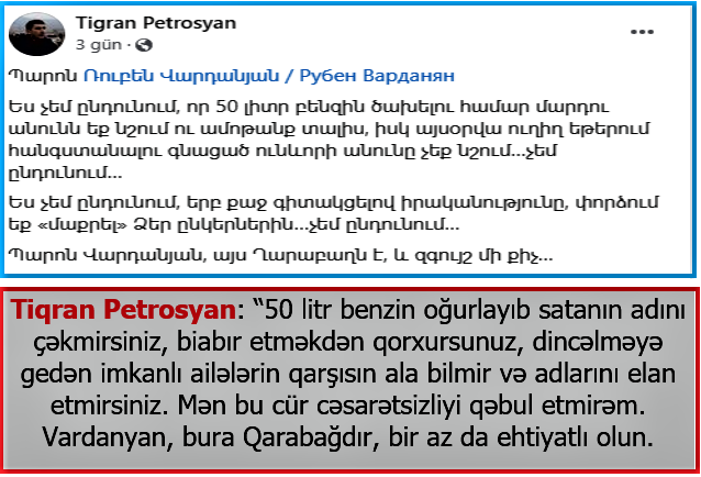 Tiqran Petrosyan adlı erməni fəalı isə Vardanyanın yarıtmaz “rəhbərliyini” belə ifşa edir: “50 litr benzin oğurlayıb satanın adını çəkmirsiniz, biabır etməkdən qorxursunuz, dincəlməyə gedən imkanlı ailələrin qarşısın ala bilmir və adlarını elan etmirsiniz. Mən bu cür cəsarətsizliyi qəbul etmirəm. Vardanyan, bura Qarabağdır, bir az da ehtiyatlı olun. mənbə
