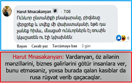 Harut Mnasakanyan deyir ki, Vardanyan, öz ailənin mənzillərini, biznes gəlirlərini götür insanlara ver, bunu etməsəniz, yoxsa burada qalan kasıblar da rusa rüşvət verib qaçacaqlar.