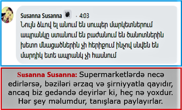 Susanna Susanna adlı istifadəçi isə deyir ki, supermarketlərdə necə edirlərsə, bəziləri ərzaq və şirniyyatla qayıdır, ancaq biz gedəndə deyirlər ki, heç nə yoxdur. Hər şey məlumdur, tanışlara paylayırlar.