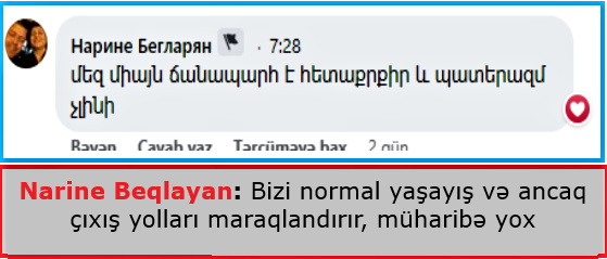 Narine Beqlayan qeyd edir ki, bizi normal yaşayış və ancaq çıxış yolları maraqlandırır, müharibə yox.