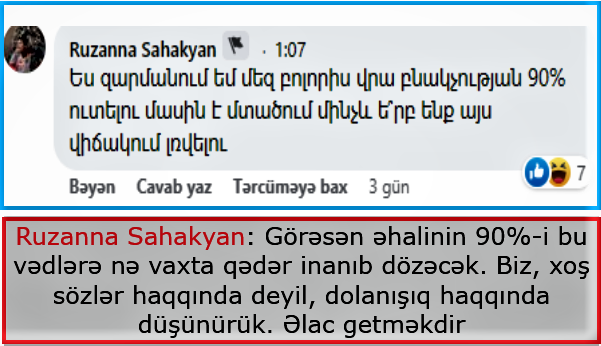 Ruzanna Sahakyan adlı qadın isə deyir ki, görəsən əhalinin 90%-i bu vədlərə nə vaxta qədər inanıb dözəcək. “Biz, xoş sözlər haqqında deyil, dolanışıq haqqında düşünürük. Əlac getməkdir”.