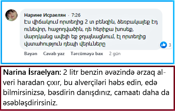Narina İsraelyan adlı Xankəndi sakini deyir ki, “2 litr benzin əvəzində ərzaq al-veri haradan çıxır, bu alverçiləri həbs edin, edə bilmirsinizsə, bəsdirin danışdınız, camaatı daha da əsəbləşdirirsiniz”.
