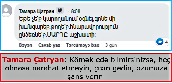 Tamara Çatryan isə kəskin etirazını belə ifadə edir: Kömək edə bilmirsinizsə, heç olmasa narahat etməyin, çıxın gedin, özümüzə şans verin.