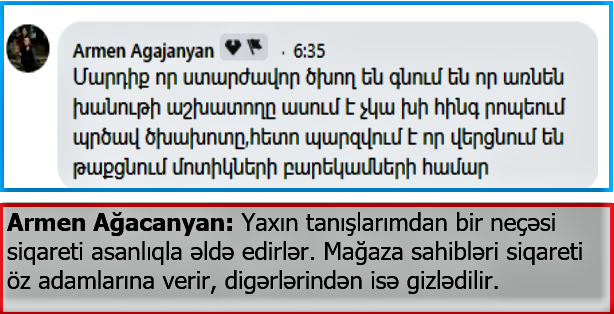 Armen Ağacanyan isə qeyd edir ki, yaxın tanışlarından bir neçəsi siqareti asanlıqla əldə edirlər. Mağaza sahibləri siqareti öz adamlarına verir, digərlərindən isə gizlədilir.