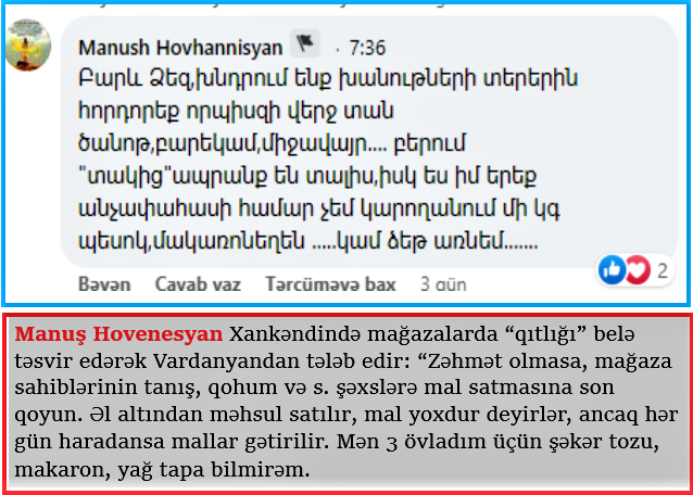 Manuş Hovenesyan adlı sakin isə Xankəndində mağazalarda “qıtlığı” belə təsvir edərək Vardanyandan tələb edir: “Zəhmət olmasa, mağaza sahiblərinin tanış, qohum və s. şəxslərə mal satmasına son qoyun. Əl altından məhsul satılır, mal yoxdur deyirlər, ancaq hər gün haradansa mallar gətirilir. Mən 3 övladım üçün şəkər tozu, makaron, yağ tapa bilmirəm”.