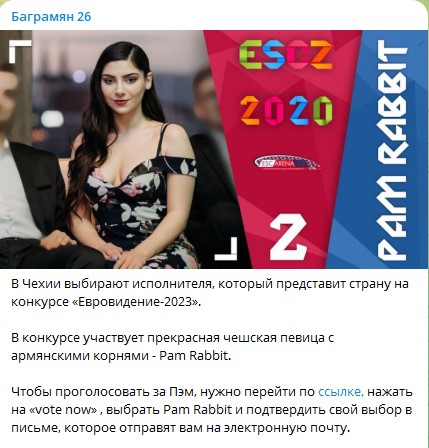 Ermənistanın “Баграмян 26” adlı rusdilli “telegram” kanalı fevralın 5-də belə bir xəbər paylaşıb: “Çexiyada ölkəni Avroviziya-2023 müsabiqəsində təmsil edəcək ifaçı seçirlər”.