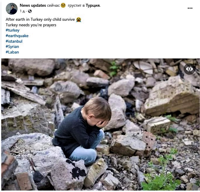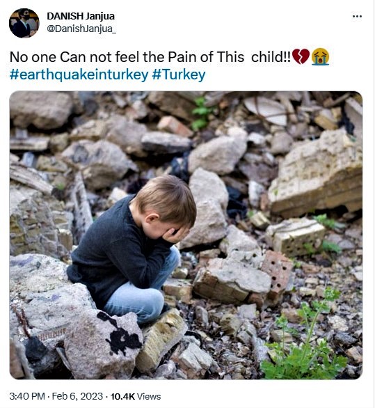 Şübhə oyadan paylaşımçlardan birini təqdim edirik. Bir uşağın zəlzələdən sonra dağınıtı qalıqları üzərində ağladığını əks etdirən ürəkdağlayıcı fotosu sosial mediada sürətli yayılır. İddia edilir ki, foto 6 fevral zəlzələsindən sonra çəkilib.