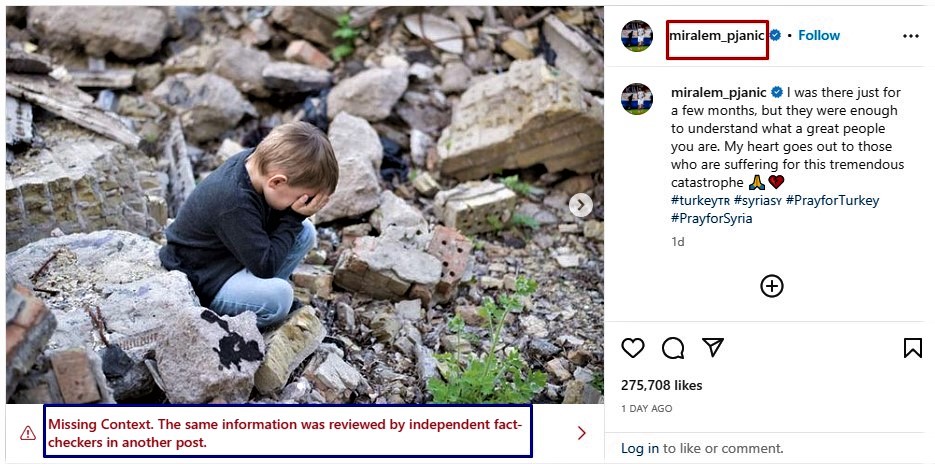 Həmin paylaşımın aşağı hissəsində "İnstagram" fotonun həqiqət olmadığı haqda qeyd verib. Həmin qeyddə 2 mənbənin faktyoxla araşdırması təqdim olunur. Bunlardan biri tnınmış AP (Associated Press) , digəri isə Reuters-di.