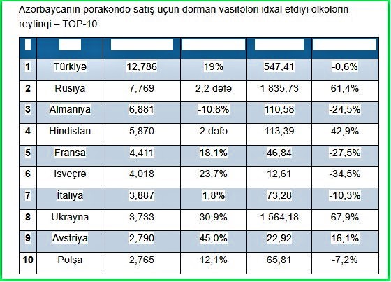 Ölkəmizə dərman vasitələri əsasən Türkiyə, Rusiya, Almaniya, Hindistan, Fransa, Çin, İsveçrə, İtaliya, Ukrayna, Avstraliya, Polşa və digər ölkələrdir. istinad