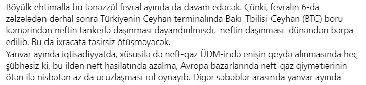 “BTC-nin fəaliyyətinə fasilə verməsi və bundan iqtisadiyyatın zərər görməsinə” gəlincə, xatırladaq ki, BTC cəmi 5 gün dayanıb və səbəbi bütün dünyanı heyrətə gətirən dəhşətli zəlzələdir. Fors-major hallarda bütün ölkələrin ticarətində belə halların yaranması müşahidə olunur. Azərbaycan gündəlik təxminən 650 min bareli neft ixrac edir və bu o deməkdir ki, 5 gündə 3,3 milyon barelə yaxın neft ixracı ləngiyib. Ölkəmizin illik neft ixracı isə təxminən 255 milyon bareldir. Yəni, qardaş ölkədə yaşanan bu ağır günlərdə Azərbaycanın illik neft ixracı həcminin 1,4 % nisbətində məhsulu ləngiyib. Bu, “1,4 faizin” illik ixracdan əldə olunan gəlirlərə təsiri isə hədsiz dərəcədə kiçikdir. Onu da unutmaq olmaz ki, 5 gün ərzində ixracı dayanmış neft məhsulları növbəti günlərdə sifarişlər üzrə bağlanmış kontraktlar üzrə öz alıcılarına tam həcmdə çatdırılacaqdır ki, bu da neft ixracında yaranmış kəsirin də aradan qalxmasına səbəb olacaq.