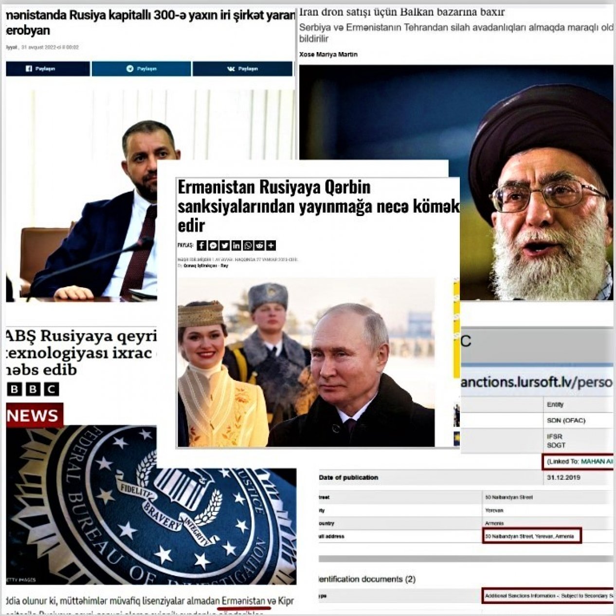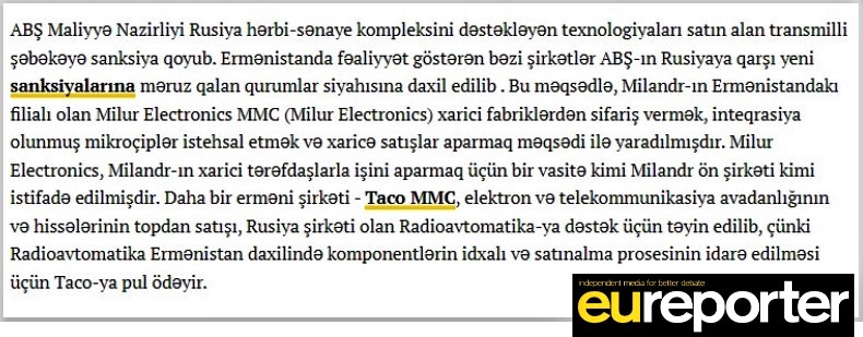 Başqa bir fakt. Bir neçə ay əvvəl ABŞ Maliyyə Nazirliyinin Xarici Aktivlərə Nəzarət İdarəsi Ermənistana məxsus “Taco” MMC-nin (Çinin “Sinno Electronics. Co Limited” şirkətinin İrəvandakı təchizatçısı) Rusiyaya elektronika məhsulları və radioavtomaika avadanlıqlarının tədarükünü həyata keçirdiyinə görə, sanksiya siyahısına salıb. mənbə