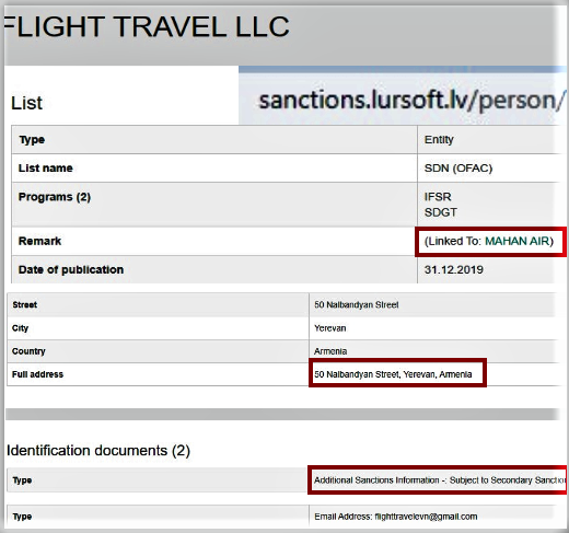 Tehran şəhərində yerləşən “Mahan Air” Uzaq və Yaxın Şərq, Mərkəzi Asiya və Avropaya beynəlxalq uçuşlar həyata keçirir və ucuş coğrafiyası çox genişdir. mənbə 2018-ci ildə yaradılmış “Flight Travel Mmc” isə “Mahan Air” İrəvandakı törəməsi kimi 2022-ci ildə aktiv daşınma sifarişlərini yerinə yetirməklə məşğul olub. mənbə Hər iki aviakompaniya mülki uçuşlar adı altında müxtəlif şübhəli malları daşıdığına görə, 2022-ci ildə ABŞ Maliyyə Nazirliyinin Xarici Aktivlərə Nəzarət İdarəsinin sanksiya siyahısına salınıb. mənbə