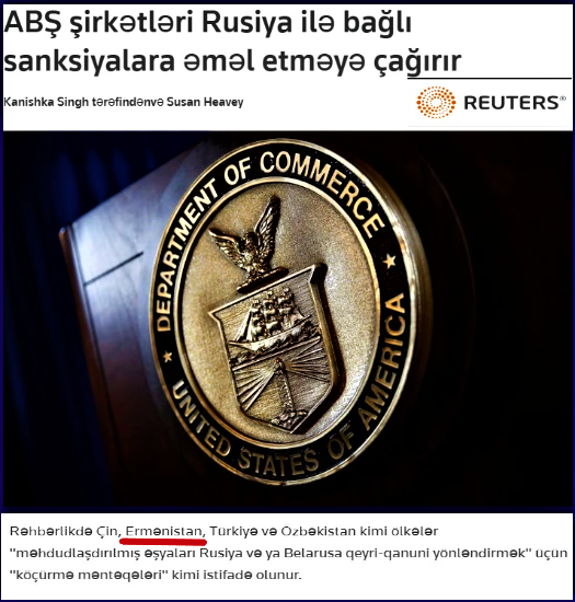 ABŞ Ticarət Departamentinin Sənaye və Təhlükəsizlik Bürosu, Xəzinədarlıq Departamentinin Xarici Aktivlərə Nəzarət İdarəsi və Ədliyyə Departamenti Rusiya və Belarusla əlaqəli sanksiyalardan və ixrac nəzarətindən yayınma hallarında üçüncü ölkələrin iştirakına dair üçtərəfli nota verib. Sənəddə qeyd olunur ki, Rusiya sanksiyalarından yayınmaq üçün ən çox yayılmış taktikalardan biri üçüncü tərəfin vasitəçiliyindən və ya daşınma məntəqələrindən istifadə etməkdir ki, bu sxemdə Ermənistanın da adı yer alır. reuters