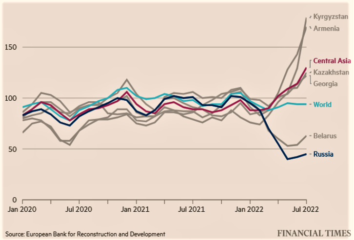 AYİB-in infoqrafikasından görünür ki, Aİ, ABŞ və Böyük Britaniyanın Rusiyaya ixracı 2022-ci ildə (may-iyul ayları üzrə statistikaya əsasən) 2017-2019-cu illərin orta göstəriciləri ilə müqayisədə yarıdan çox azalıb, ancaq Ermənistan və Qırğızıstanın Rusiya ilə ticarətinin 80 faizdən çox artması hesabına aradakı “boşluq” doldurulub. Bu infoqrafika tam şəkildə ABŞ-nin Rusiyaya qanunsuz olaraq daşınan mallarda Ermənistanın iştirakçı ölkə olmasına dair bəyanatı ilə üst-üstə düşür.