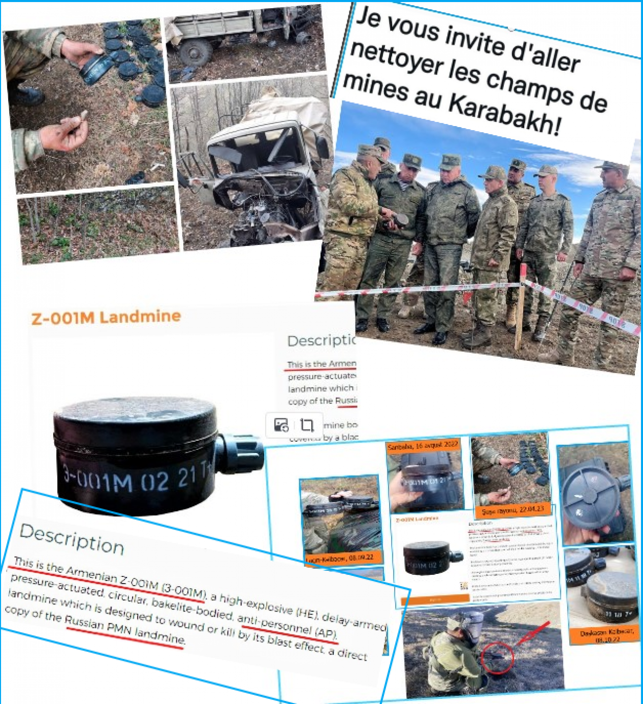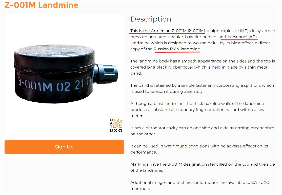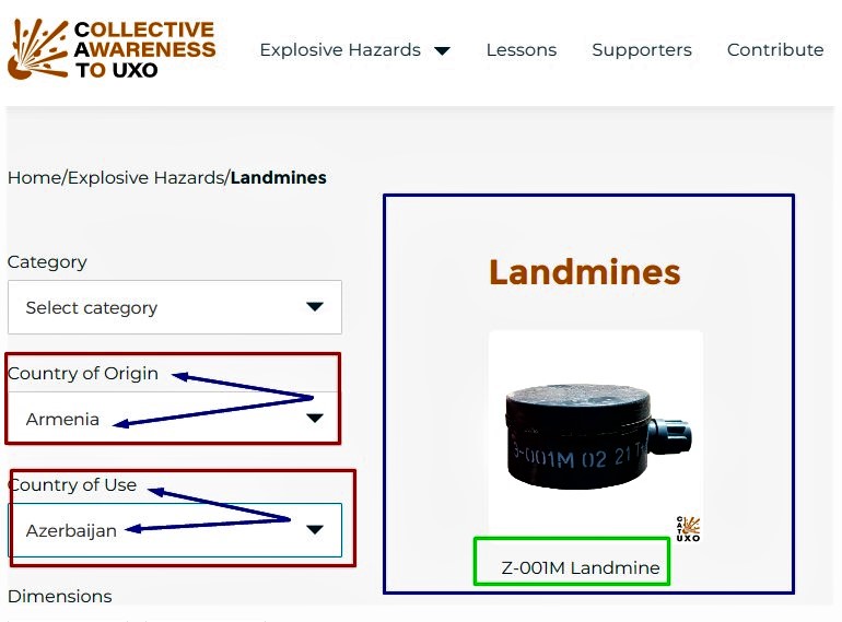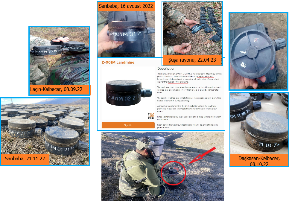 Bunun üçün 10 ildən artıq müddətdir fəaliyyət göstərən partlamamış hərbi sursatlar üzrə ixtisaslaşmış “Collective Awareness to UXO” (Partlamamış hərbi sursatlar üzrə kütləvi maarifləndirmə) saytına diqqət etmək lazım gəlir. Həmin saytın axtarış bölümündə "Ermənistan" yazıb axtarış versək bu ölkədə istihsal olunan və kütləvi tətbiq edilən minaların siyahısı və haqlarında məlumat ala bilərik. İkinci cəhddə isə yenə həmin saytda “mina istehsal edən ölkə” qrafasında “Ermənistan”“tətbiq edildiyi ölkə” qrafasında isə “Azərbaycan” yazıb, axtarışa versək Z-001M (З-001M) tipli piyada əleyhinə mina aşkar olunur.