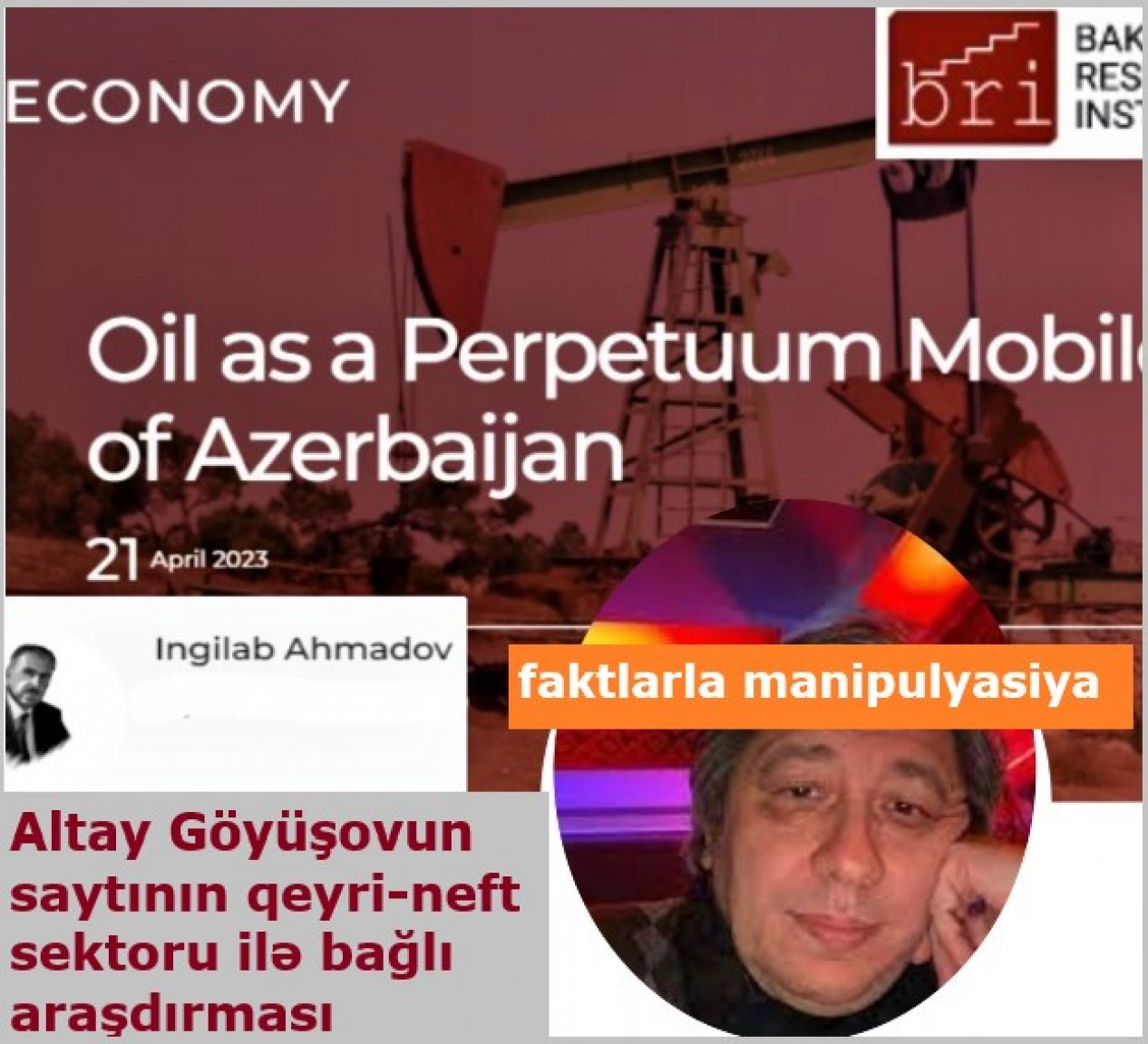 Xəzər Universitetinin Avrasiya Hasilat Sənayesi Bilik Mərkəzinin direktoru, iqtisadçı İnqilab Əhmədovun Altay Göyüşovun rəhbərlik etdiyi Bakı Araşdırmalar İnstitutunun (Baku Research İnstitute) veb-səhifəsində dərc edilən “Neft Azərbaycanın əbədi mobili kimi” adlı məqaləsində ölkəmizin iqtisadi inkişafının yalnız neftə əsaslanaraq tək sütun üzərində dayandığı, qeyri-neft sektorunun, o cümlədən kənd təsərrüfatının zəif inkişafına dair ittihamlar yer alır. Müəllif qeyd edir ki, ölkədə istehsal olunan ÜDM-in 47,8 faizini təmin edən neft sektorunda cəmi 39,4 min nəfər işlədiyi halda, ÜDM-in 4,7 faizini təmin edən kənd təsərrüfatında ümumi əhalinin 36,2 faizi çalışır.