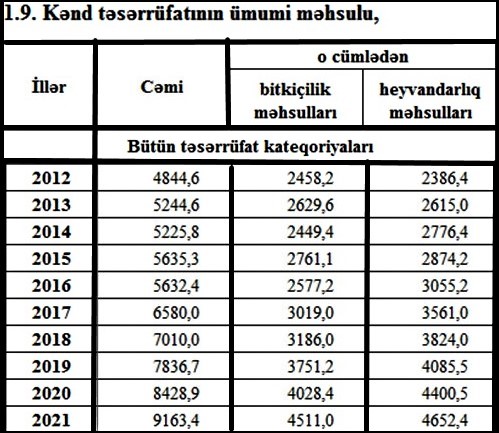 Azərbaycanda son 10 ildə kənd təsərrüfatı məhsullarının istehsal həcmi faiz ifadəsi ilə 140 faiz, nominal həcmi dəyəri baxımından 2,5 dəfə artıb. Əgər 2012-ci ildə istehsal olunan kənd təsərrüfatı məhsullarının ümumi həcmi 4,8 milyard manat təşkil edirdisə 2021-ci ildə bu rəqəm 9 milyard 163 milyon manatı ötüb. (mənbə) 2022-ci ildə isə kənd təsərrüfatı məhsullarının istehsal həcmi 3,4% artaraq 10 milyard 984,2 milyon manat təşkil edib. (istinad)