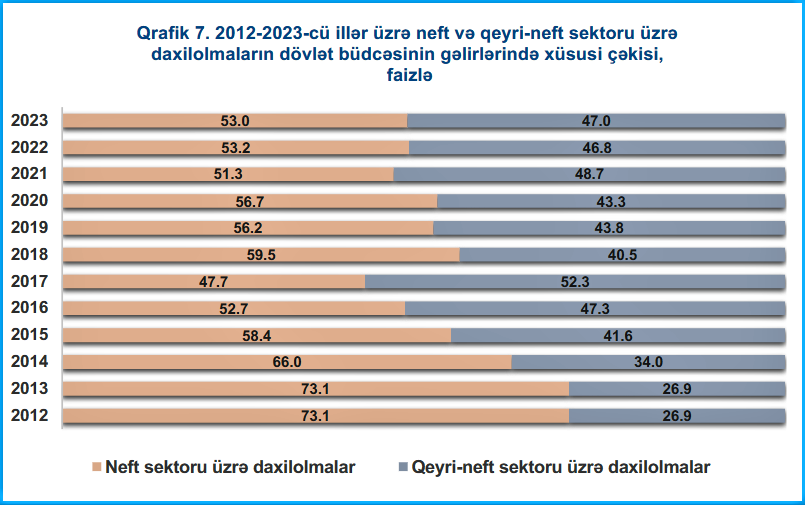 Bu tendensiya 2023-cü ilin birinci rübündə də davam edib. İlk ründə büdcənin gəlirləri 8,3 milyard manat təşkil edib ki, onun 4 milyard 899,5 milyon manatı vergilərin payına düşür. 4,9 milyard manat vergi yığımlarının isə 2 milyard 618 milyon manatı qeyri-neft-qaz sektoruna aiddir. Yəni, yanvar-mart aylarında ümumi vergi yığımlarının 55 faizi birbaşa qeyri-neftin payına düşüb. istinad.