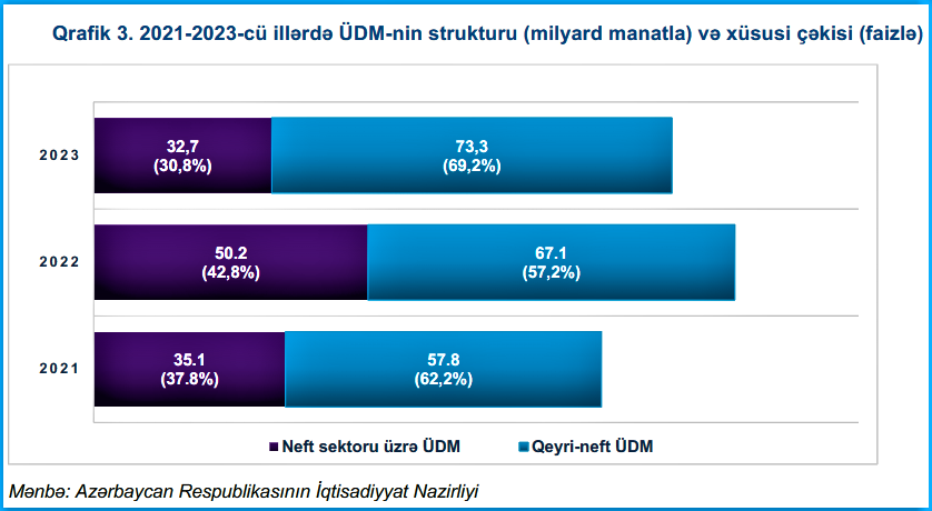 Bu fikirlərin yalnış olmasını konkret rəqəm və faktlar əsasında göstərməyə çalışaq. Son 10 ildə iqtisadi artımın əsas hərəkətverici qüvvəsi neft sektorundan qeyri-neft sektoruna transformasiya olunub və nəticədə, ÜDM-də neft sektorunun payı əvvəllər 60-65 faiz təşkil etdiyi halda 2022-ci ildə bu rəqəm 42,8 faizə düşüb. Yəni, İ.Əhmədovun iddia etdiyi kimi 47,8 Faiz deyil. 2023-cü ildə isə neftin ÜDM-də çəkisi 37,8 %-ə qədər enəcək. ÜDM-də payı isə 2022-ci ildə 57,2 faizə bərabər olan qeyri-neft sektorunun payı isə 2023-cü ildə 69,2 faizə çatacaq. mənbə