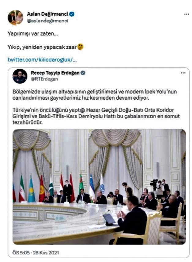 "Marmaray və Bakı-Tbilisi-Qars xətti ilə Londondan Çinə, Yeni İpək Yoluna qədər fasiləsiz dəmir yolu xəttini həyata keçirdik. Haburdan Fars körfəzinə dəmir yolu və böyük yol əlaqəsini təqdim edirik. Bəzi insanların xəyalları belə bizim gördüyümüzə çatmır!"
