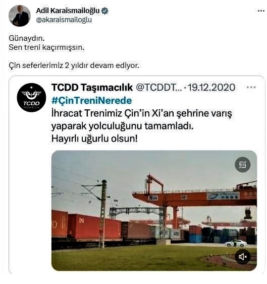 Elə bu səbəbdən araşdırmanı Türkiyənin Nəqliyyat və infrastruktur naziri Adil Qaraismailoğlunun prezidentliyə namizədin məlum videosuna verdiyi reaksiya ilə yekunlaşdırırıq.  “Sənin üçün qatar çoxdan gedib. Bizim Çinlə əlaqələrimiz 2 ildir ki, davam edir". Adil Qaraismailoğlu daha sonrasında yazır: