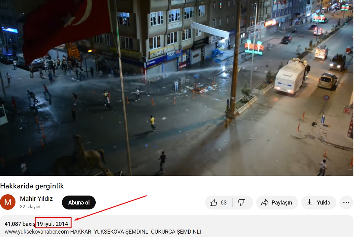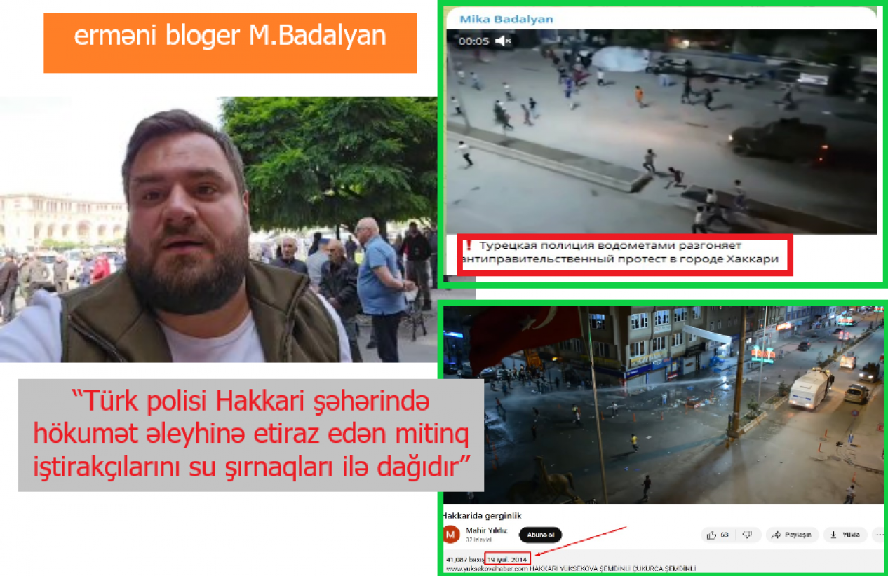 Mika Badalyan adlı erməni bloger Türkiyədəki prezident seçkilərindən sonra kütləvi iğtişaşların baş verməsi haqda məlumat paylaşıb və “Türk polisi Hakkari şəhərində hökumət əleyhinə etiraz edən mitinq iştirakçılarını su şırnaqları ilə dağıdır” başlığı ilə video yayıb.