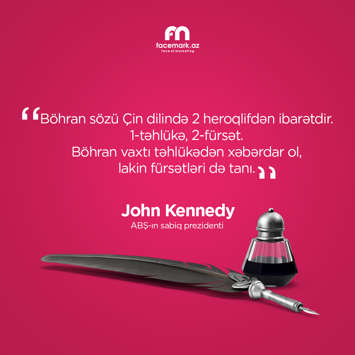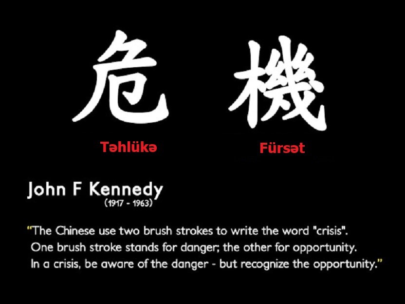“Google”da yeni axtarış apardıqda Kennedinin 12 aprel 1959-cu il tarixli çıxışında bu cümləyə yer verdiyini görürük: “Çin dilində yazıldıqda “böhran” sözü iki xarakteri özündə birləşdirir. Biri təhlükəni, digəri isə fürsəti ifadə edir. Təhlükə əlamətləri ətrafımızdadır. İstehsal gücümüzün yarısından azına malik olan Sovet İttifaqı ən azı hərbi elm və texnologiyanın bəzi əsas sahələrində bizimlə bərabər idi”.