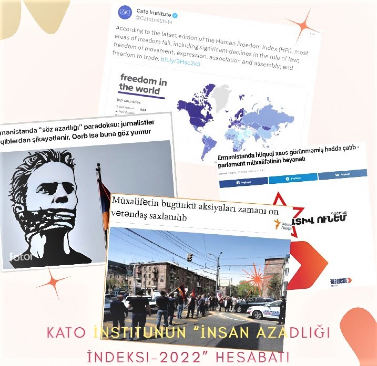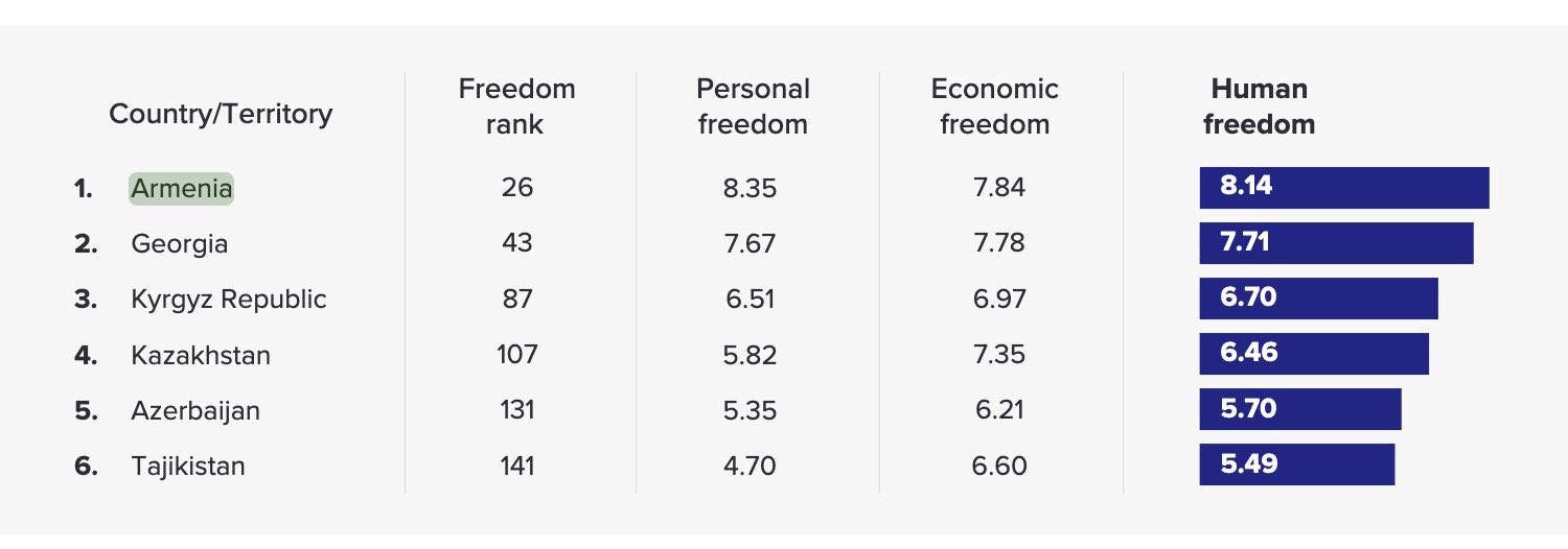 ABŞ-da fəaliyyət göstərən Kato İnstitutu ( Cato Institut ) tərəfindən fevral ayında  dərc edilən “İnsan Azadlığı İndeksi-2022” (The Human Freedom Index (HFI) hesabatında Ermənistan 26-cı, Gürcüstan 43-cü, Azərbaycan 131-ci, Türkiyə 130-cu yerdə  qərarlaşıb. Digər türk dövlətlərindən Qırğızıstan 87-ci, Qazaxıstan 107-ci sırada yerləşdirilib. İlk 10-luq ölkələri qrupuna İsveçrə, Yeni Zelandiya, Estoniya, Danimarka, İrlandiya, İsveç, İslandiya, Finlandiya, Hollandiya və Lüksemburq daxildir. Ən aşağı sırada isə Çin, Səudiyyə Ərəbistanı, İran, Venesuela, Suriya yer alır.