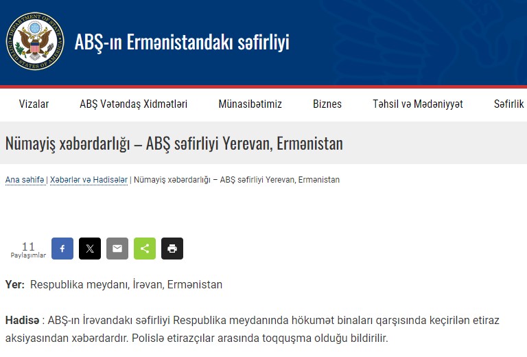 ABŞ Dövlət Departamentinin bəyanatında da Ermənistandakı polis toqquşmaları ilə bağlı ictimai sabitlikdən narahatlıq ifadə olunur.