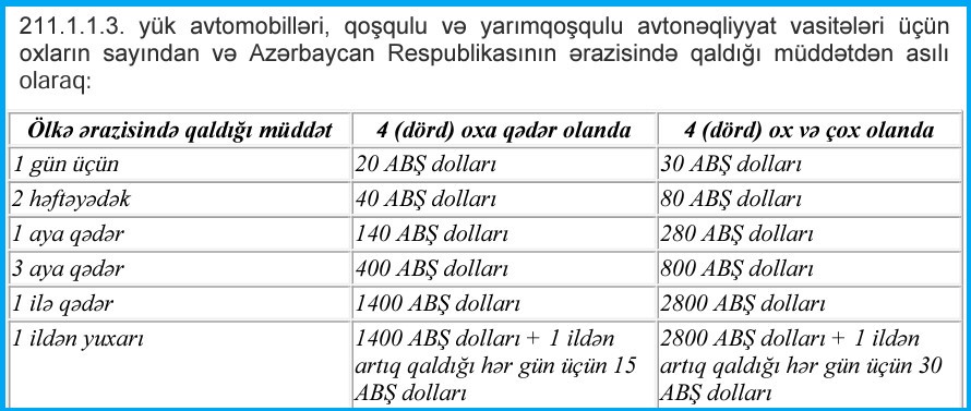 Sürücülərin burada yalnız bir öhdəliyi var, onlar idarə etdiyi yük maşınlarının sərhəd-gömrük qapısına daxil olub çıxmasına görə, yol vergisi və dövlət rüsumunu ödəməlidirlər. Bu vergi və rüsumların ödənilməsinin hüquqi əsası isə bütün dünyada qəbul olunmuş standartlara əsaslanır, yəni, beynəlxalq yük daşımaları həyata keçirən nəqliyyat vasitələri üçün müəyyən edilmiş tariflərdir.