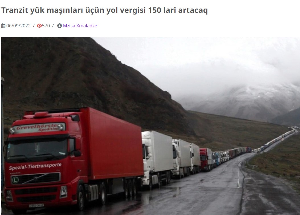 “TIR” sürücülərinin yaxşı nümunə kimi çəkdikləri Gürcüstanda yük daşınmalarının tarifləri isə Azərbaycandan heç də ucuz deyil. 2022-ci ilin iyun ayından qüvvəyə minmiş yeni vergi dərəcələrinə əsasən, Gürcüstanda tranzit yük maşınları üçün yol vergisi artırılaraq 200 laridən 350 lariyə (130 dollar) çatdırılıb. Bu, Azərbaycanın gömrük ərazisində 2 həftəlik park edən 4 oxlu yük maşınlarına tətbiq edilən vergidən (80 dollar) az qala 2 dəfə çoxdur. istinad
