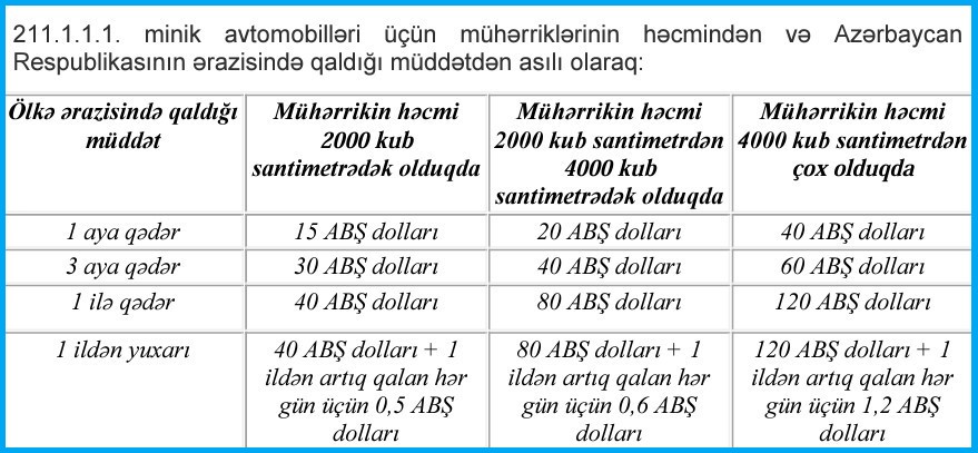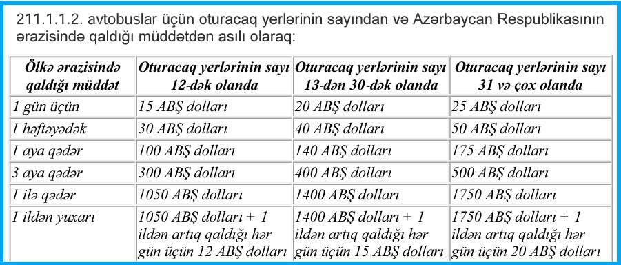 Bundan başqa, “Dövlət rüsumu haqqında” Qanunun 24-cü maddəsinə əsasən, (“Avtomobil nəqliyyatı ilə sərnişin və yük daşımalarına icazənin verilməsi üçün dövlət rüsumunun dərəcələri”) Azərbaycan ərazisində beynəlxalq avtomobil daşımalarını tənzimləyən icazənin verilməsi üçün dövlət rüsumu tutulur. Belə ki, Azərbaycan Respublikası ilə xarici ölkələr arasında avtomobil nəqliyyatı ilə daşımaları yerinə yetirmək üçün operatorlara beynəlxalq yük və qeyri-müntəzəm sərnişin daşımalarına buraxılış vəsiqəsinin verilməsi üçün 250 manat dövlət rüsumu müəyyənləşib.
