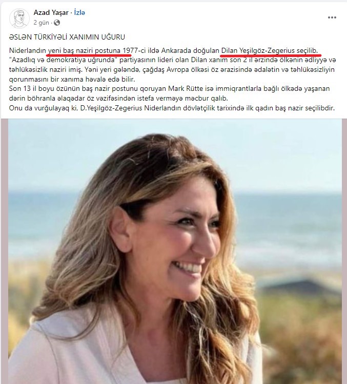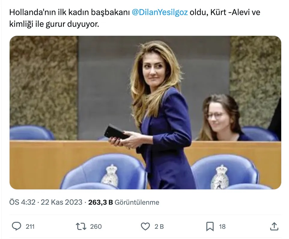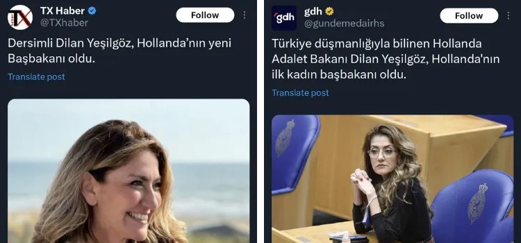 Türkiyə və Azərbaycanda sosial media istifadəçiləri, jurnalistlər və media qurumları Niderlandda seçki başa çatar-çatmaz Dilan Yeşilgözü baş nazir elan etdilər.
