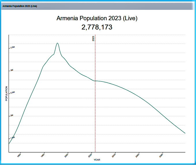 “World Population Review 2023” hesabatına əsasən, Ermənistan əhalsinin sayı 1988-ci ilədəki 3,1 milyon nəfərdən 2,8 milyon nəfərə düşübdür.