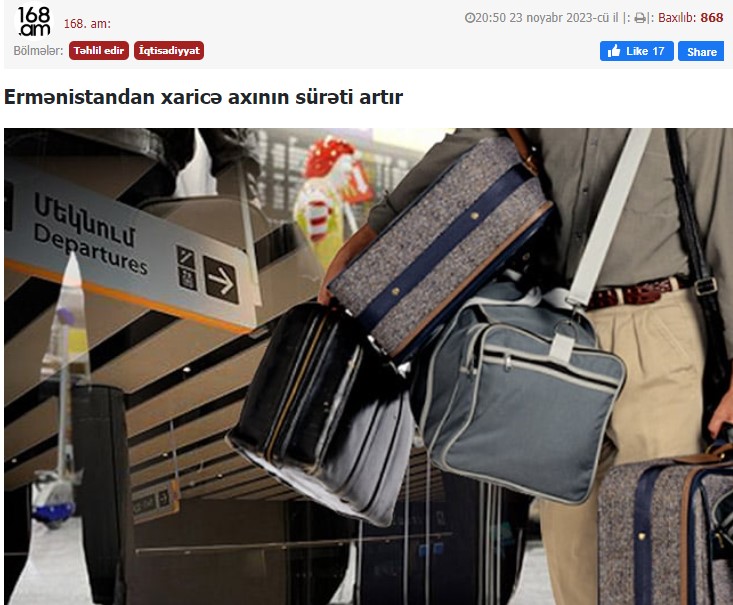 Ermənistanın “168.zham” nəşri yazır ki, hökumətin açıqladığı rəqəmlər və verdiyi vədləri aldadıcıdır, Rusiyadan və Hindistandan ötən il gələnlər hesabına demokrafik balansda müvəqqəti müsbət saldo yaransa da, 2023-cü ilin son aylarındakı miqrasiya prosesləri mənfi saldonun gücləndirib. Təkcə, cari ilin iyul-sentyabr aylarında ölkədən gedən əhalinin axını ölkəyə daxil olan axını təqribən 29 min nəfəri ötüb.