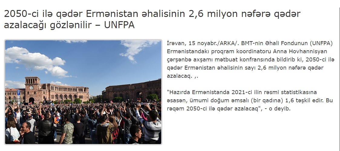 Beynəlxalq hesabatlar və statistika isə Ermənistanda demoqrafik vəziyyətin daha da pisləşəcəyini, son illərin statistikasından doğan geriləmənin qarşıdakı illərdə davam edəcəyini göstərir.