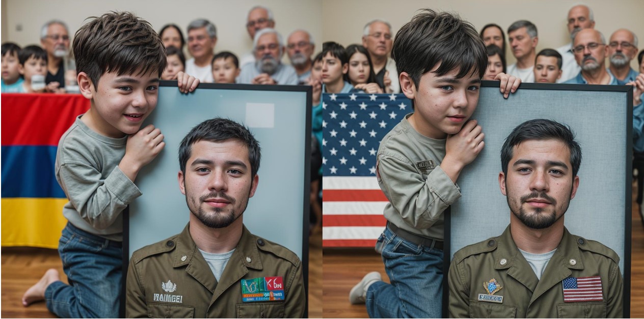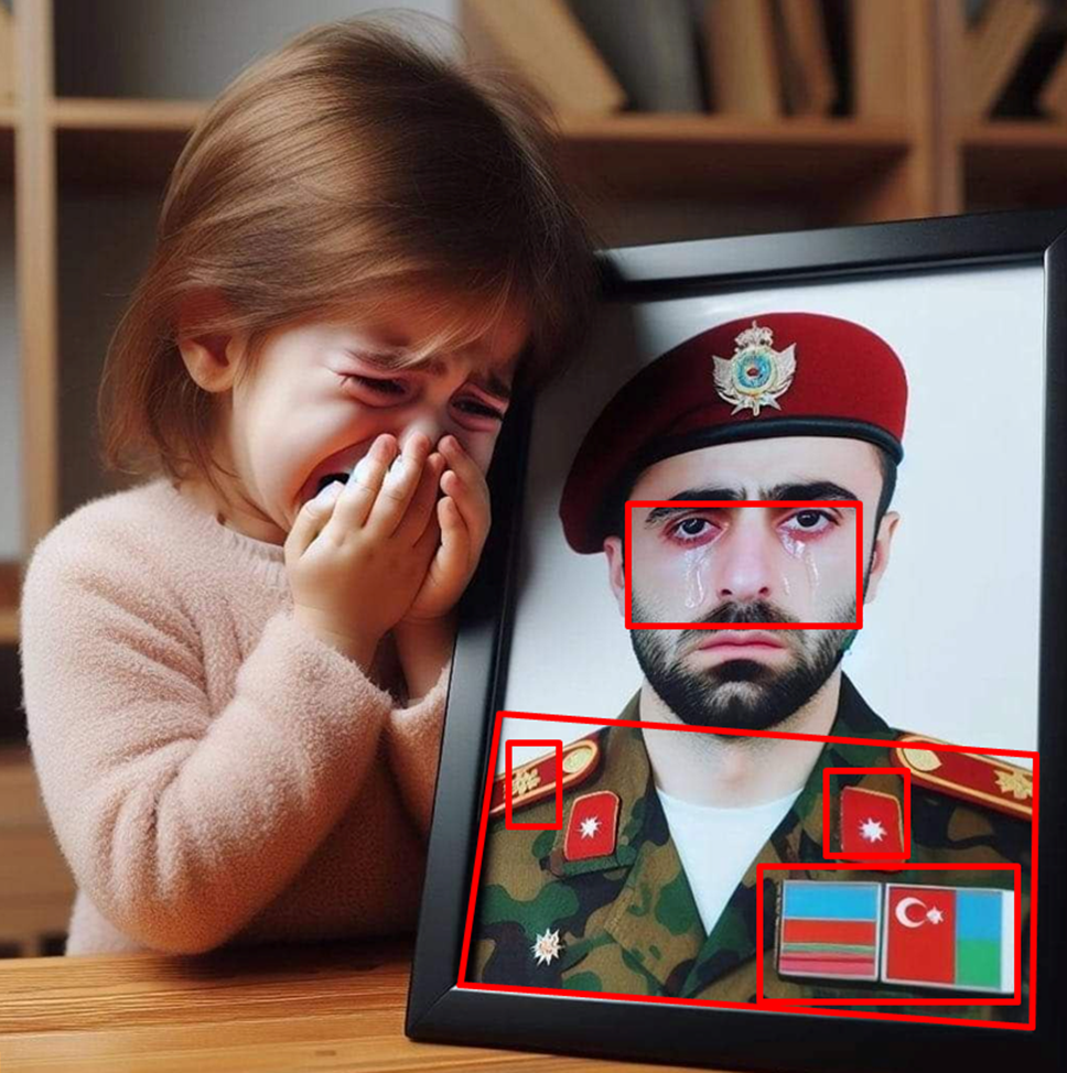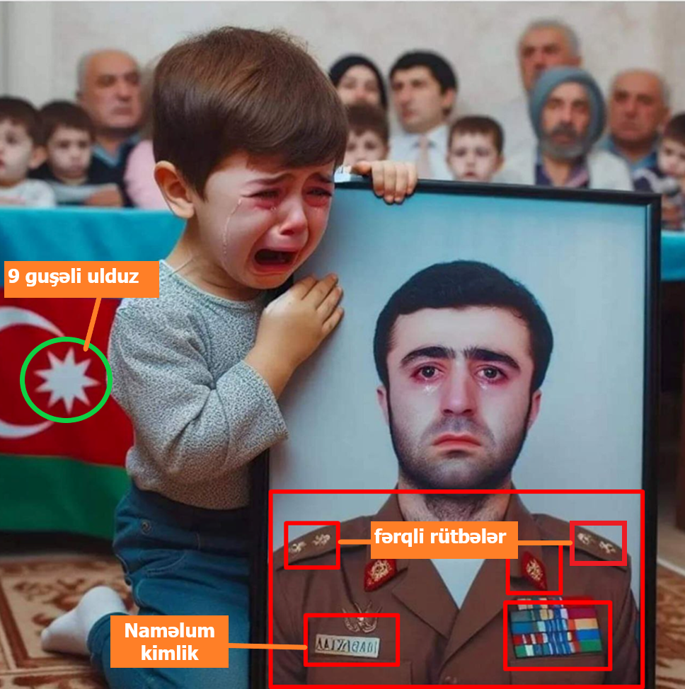 “Ağlayan şəhid”, Azərbaycan Ordusuna xas olmayan geyim forması, rütbə və yaxalıq fərqlilikləri, Azərbaycan bayrağının rənglərinin qarışması və isimliyin görünməməsi fotonun Süni İnllekt məhsulu olduğunu bir daha təsdiqləyir.