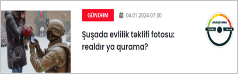 Xatırladaq ki, az müddət öncə “Azərbaycan əsgəri sevdiyi xanıma Şuşa şəhərində evlilik təklif etdi” adında paylaşılan şəkilin süni intelekt saytları vasitəsi ilə düzəldildiyini sübut etmişdik.
