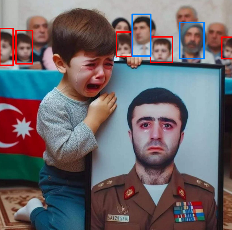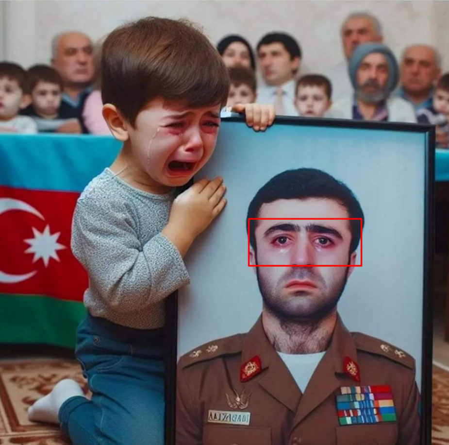 Fraqment 1. Hərbi qanunvericiliyə görə, hərbçinin ağlayaraq sənəd fotosu çəkdirməsi mümkün deyil. Həmçinin, Şəhid ailəsinin “ağlayan şəhid” protretini yas mərasimində nümayiş etdirməsi inandırıcı görünmür. Hələ belə fakta rast gəlinməyib. Belə anlaşılır foto Süni intellekt (Sİ) proqramları vasitəsilə hazırlanıb və müəlliflər fotonun təsirli alınması üçün Sİ-yə azyaşlının ağlaması “əmri” veriblər və Sİ "ağlamağı" mərhum şəxsə də şamil edib.