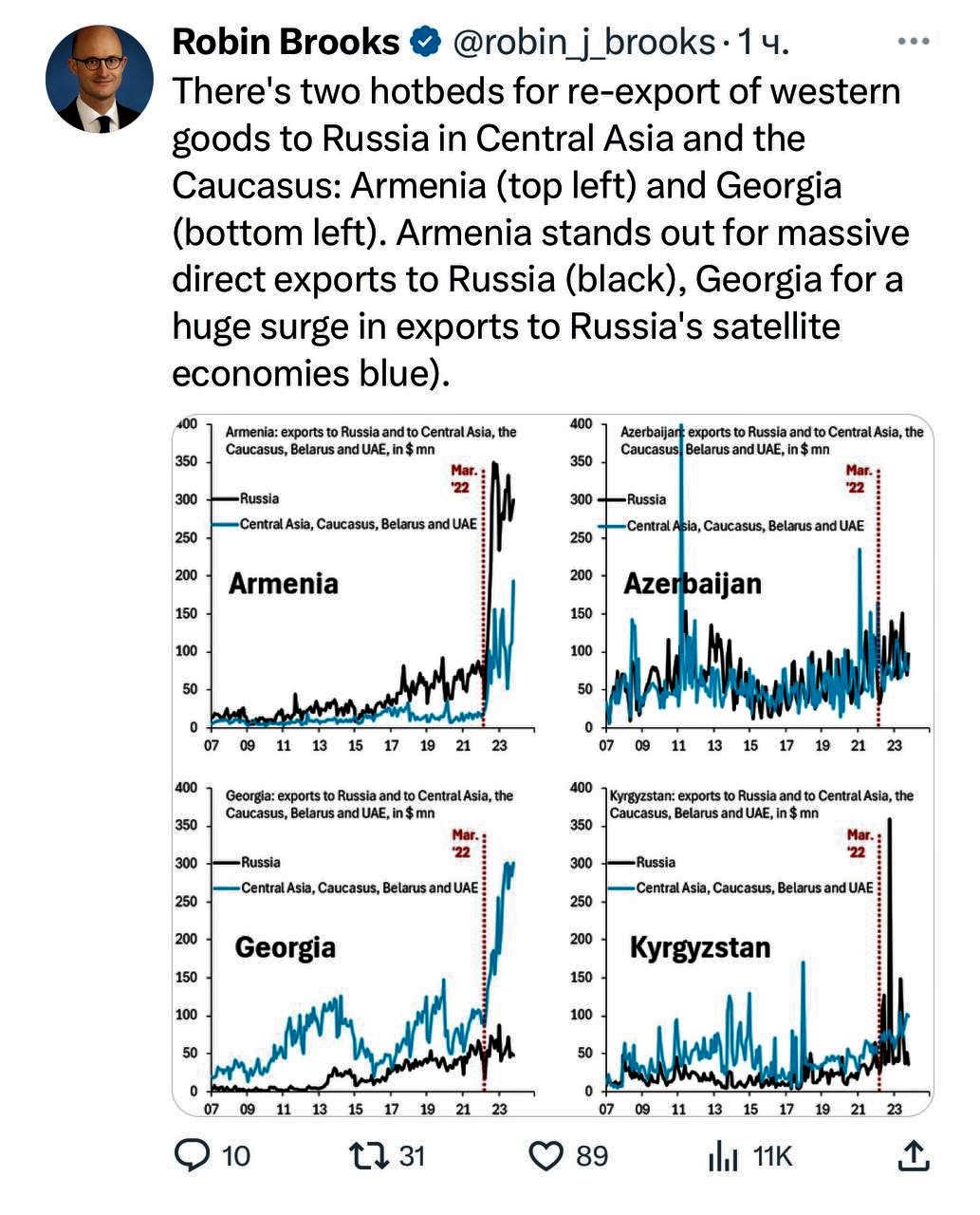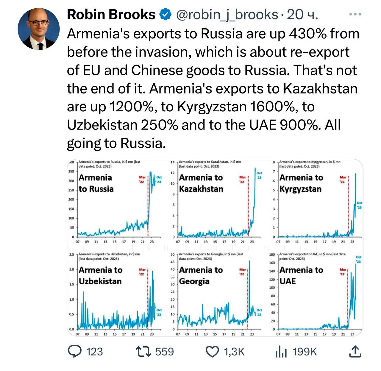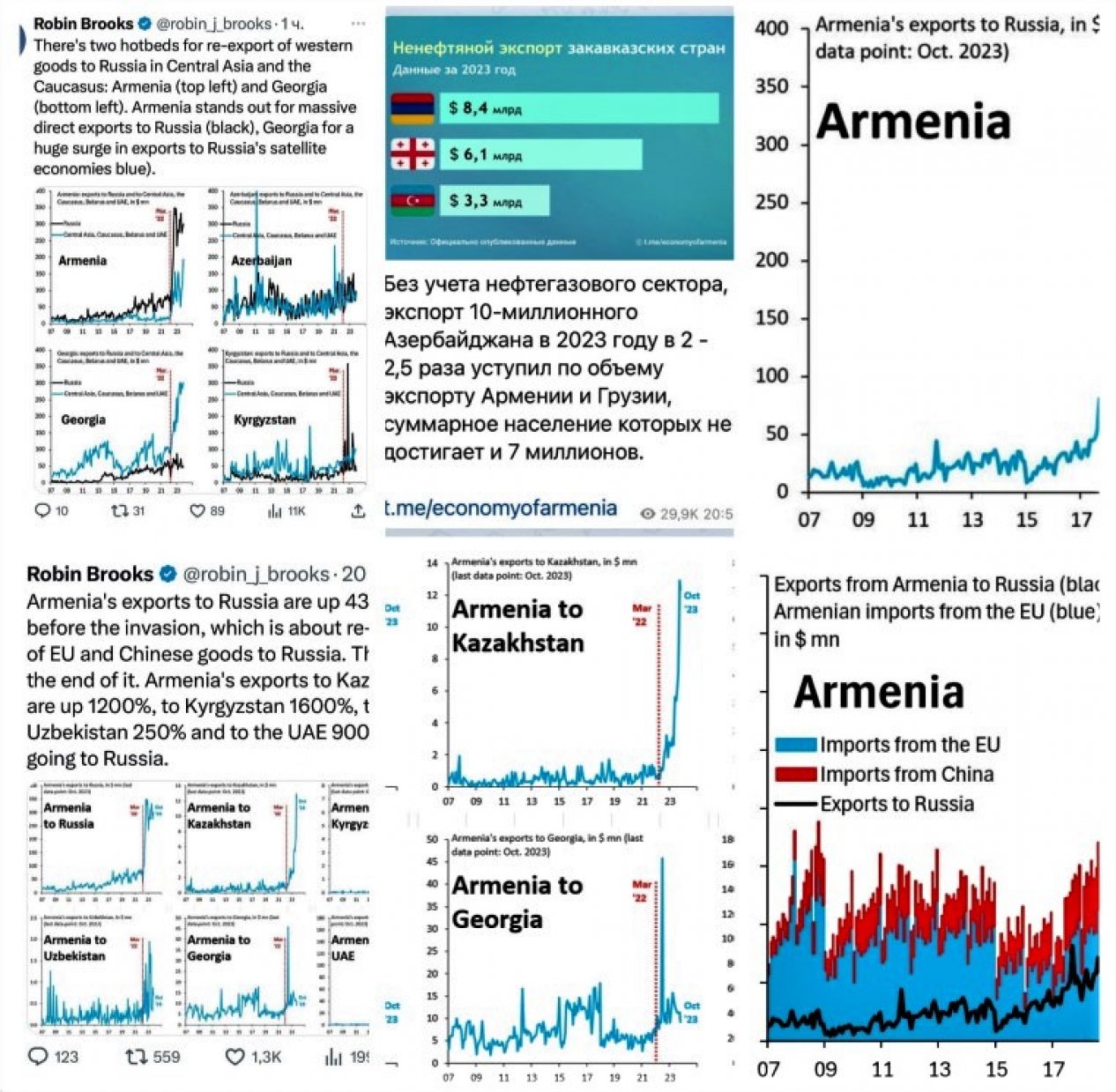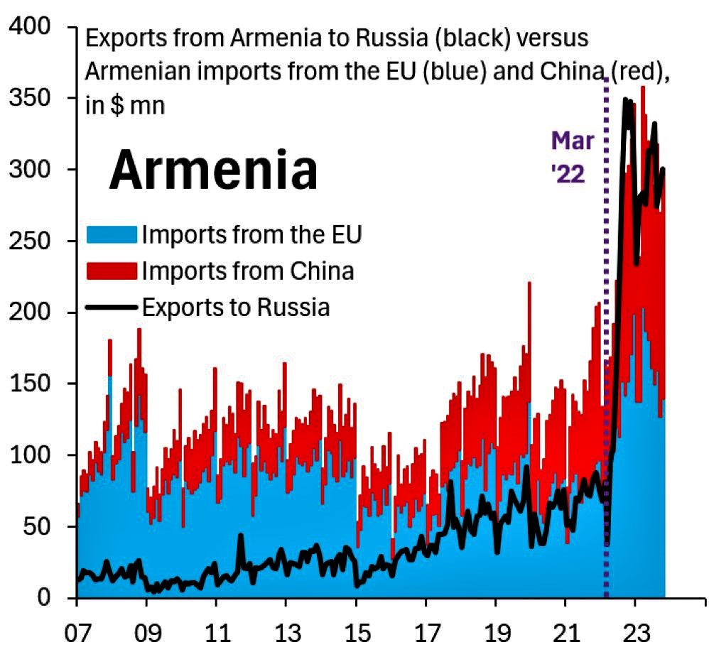 R.Bruks qeyd edir ki, Ermənistanın Rusiyaya ixracı işğaldan əvvəlki dövrlə müqayisədə 430% artıb ki, bu da Aİ və Çin mallarının Rusiyaya təkrar ixracı deməkdir. İş bununla bitmir, son bir ildə Ermənistanın Qazaxıstana, Qırğızıstana, Özbəkistana və BƏƏ-yə də ixracları rekord rəqəmlərlə artıb. istinad