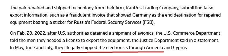ABŞ Ticarət Departamentinin Sənaye və Təhlükəsizlik Bürosu, Xəzinədarlıq Departamentinin Xarici Aktivlərə Nəzarət İdarəsi və Ədliyyə Departamenti Rusiya və Belarusla əlaqəli sanksiyalardan və ixrac nəzarətindən yayınma hallarında üçüncü ölkələrin iştirakına dair üçtərəfli notasında da gizli daşınma sxemində Ermənistanın adı yer alır. mənbə