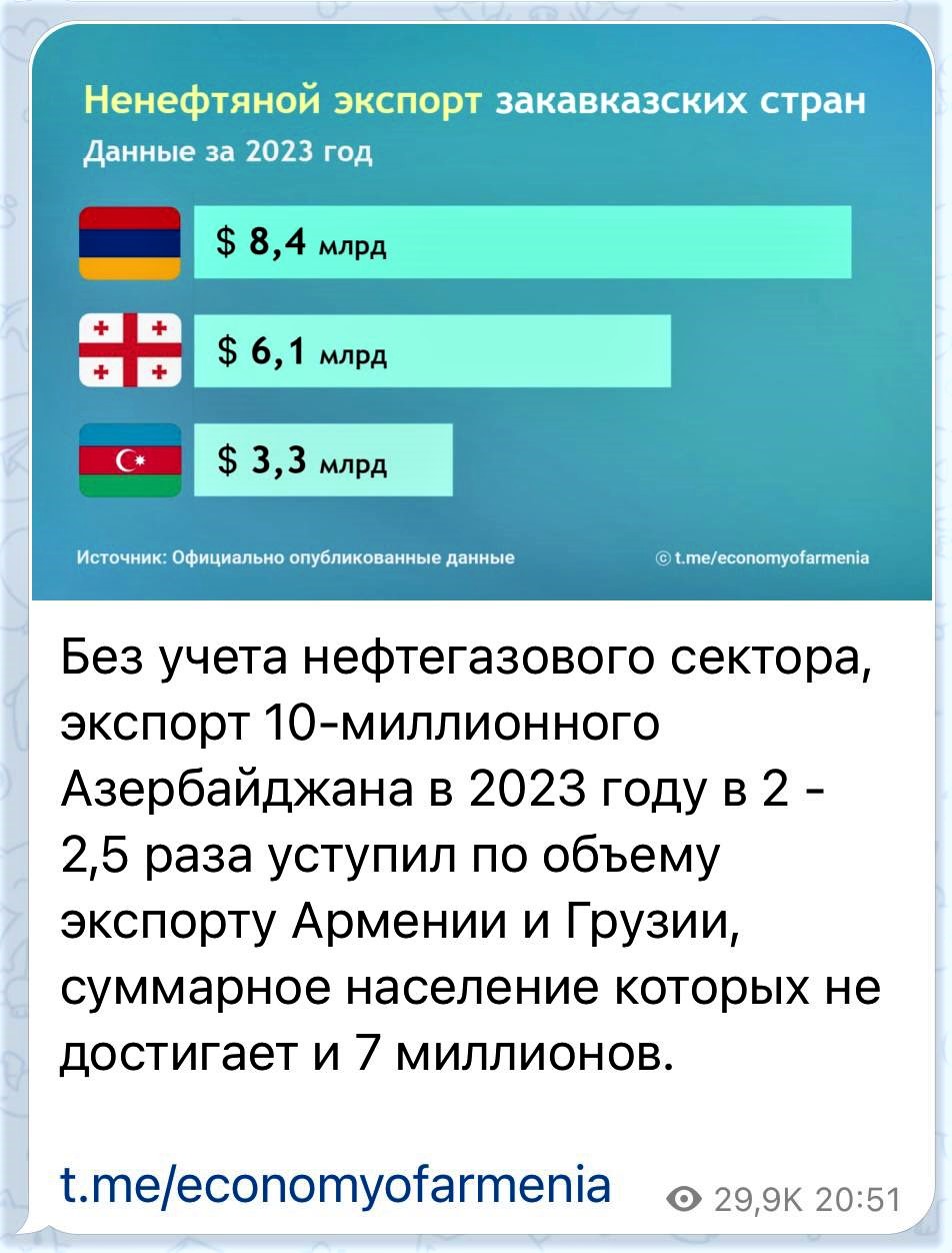 Sosial mediada Ermənistanın 2023-cü ildə xarici ticarət dövriyyəsinin, konkret olaraq ixrac qabiliyyətinin böyüyərək 8,4 milyard dollara çatmasına və Cənubi Qafqazda neftsiz ixracın həcminə görə, ilk yerdə dayanmasına dair məlumat və infoqrafika yayılıb. Yayılan məlumatlarda qeyd olunur ki, 2023-cü ildə Ermənistanın xalis ixracı 8,4 milyard dollar, Gürcüstanın ixracı 6,1 milyard dollar, Azərbaycanın qeyri-neft ixracı isə 3,3 milyard dollar təşkil edib. mənbə
