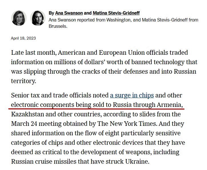“The New York Times” ötən il Ermənistanın ABŞ və Avropadan aldığı bir sıra elektrotexniki vasitələri təkrar ixrac kimi Rusiyaya çatdırmasından narahatlığını ifadə edən yazı dərc etmişdi. ABŞ Sənaye və Təhlükəsizlik Bürosunun möhürü ilə işarələnmiş bir sənəddə deyilir ki, 2022-ci ildə Ermənistan 2022-ci ilə nisbətən ABŞ-dan 515 faiz, Avropa İttifaqından isə 212 faiz çox çip və prosessor idxal edib və daha sonra həmin məhsulların 97 faizini Rusiyaya ixrac edib.
