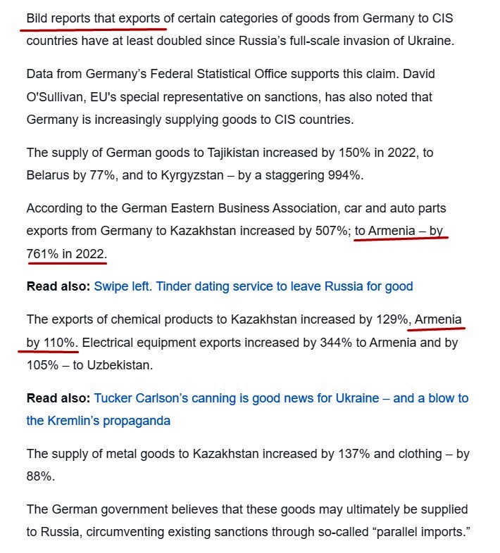 “Bild” nəşri də apardığı araşdırma nəticəsində Almaniyanın sənaye məhsullarının MDB ölkələri vasitəsilə Rusiyaya çatdırılması yollarının gizli sxemini aşkar edib. Nəşr Federal statistika orqanının məlumatına əsasən, qeyd edir ki, Rusiyaya sanksiyalar tətbiq olunduqdan sonra Almaniyadan Orta Asiya və Ermənistana ixrac 2 dəfədən çox artıb. İxrac olunan məhsulların böyük əksəriyyəti reeksport mənşəlidir və Rusiyaya çatdırılır. (mənbə)
