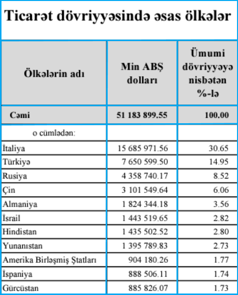(Dövlət Gömrük Komitəsi. Xarici ticarətin gömrük statistikası.2023-cü il. Səh 27-32).