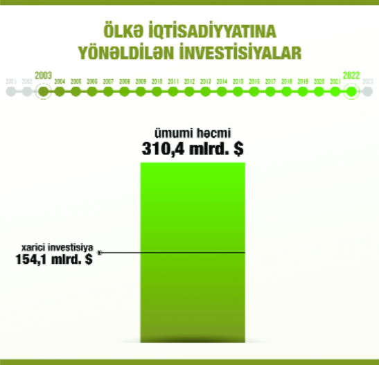 Azərbaycan iqtisadiyyatına isə son 30 ildə yatırılmış sərmayələrin həcmi 320 milyard dollardan da çox olub. Təkcə, 2003-2022-ci illər ərzində ölkəmizin iqtisadiyyatına yönəldilən investisiyaların ümumi həcmi 310,4 milyard dollar təşkil edib ki, onun yarısı və ya 154,1 milyard dolları xarici investisiyardır.